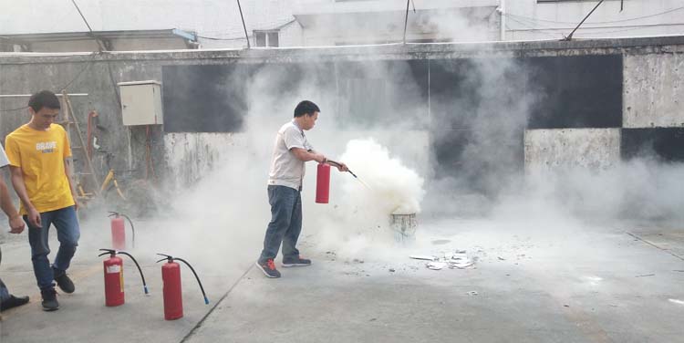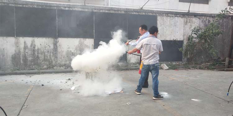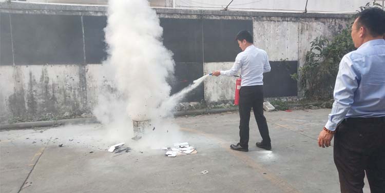 公司消防隊(duì)員使用手提式干粉滅火器進(jìn)行滅火演示,全體員工現(xiàn)場(chǎng)觀看。